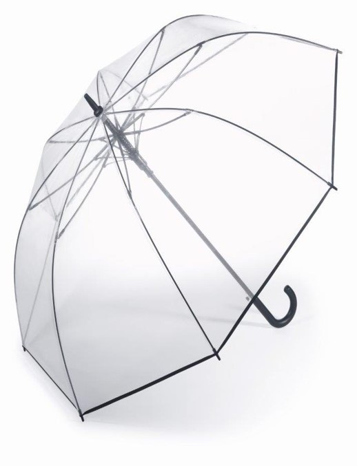 Paraguas de hombre largo transparente con puño de pasta negro. Cuenta con 8 varillas de 70 cm y un tejido de PVC. con ribete negro