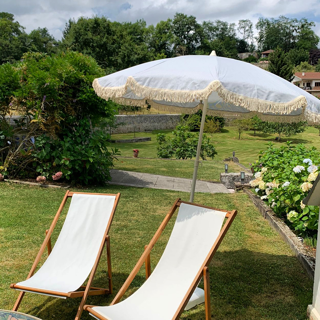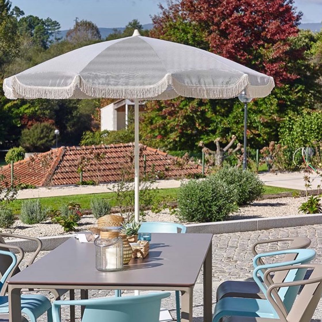 Sombrilla Parasol de terraza y jardin rayada con flecos